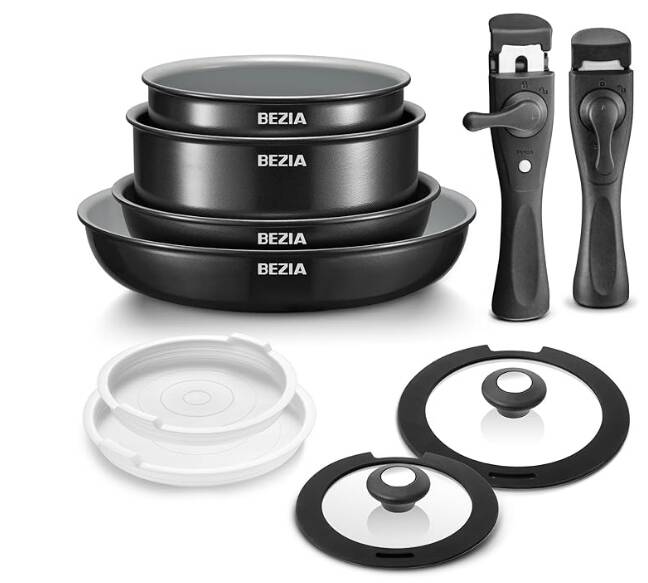 BEZIA Pfannenset mit abnehmbaren Griffen, Töpfe und Pfannen Set mit gesunder Keramikbeschichtung, Induktions Pfannen Set 10-tlg